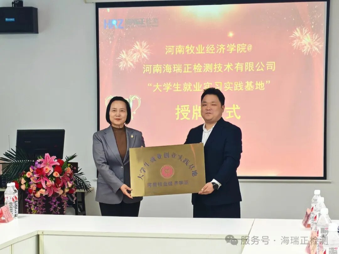 為進(jìn)一步推動(dòng)合作落地,尹新明校長(zhǎng)代表學(xué)校向海瑞正檢測(cè)授予“大學(xué)生就業(yè)實(shí)習(xí)實(shí)踐基地”和“百名專(zhuān)家助百企工程服務(wù)基地”牌匾。